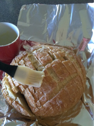 Last, wrap the bread in foil and place on a baking sheet and into a 350 degree oven for 15 minutes. Take it out, uncover the top and bake for another 10 minutes. It's seriously good...if you like warm bread, cheese and butter of course. Pull back the foil and transfer to a dish or just eat from the pan like we do :)